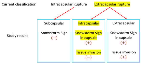 This departure in ultrasonography from other imaging modalities forms the foundation for our study, where we aim to reconcile the discrepancies between the two ultrasonographic classifications and pathology. To address this disparity, we investigated 111 periprosthetic capsules in silicone breast implant ruptures by comparing snowstorm signs in preoperative ultrasound with silicone migrations to capsules identified through pathology. We cross-matched the two intra- and extracapsular rupture classifications with the three pathologic conditions of the capsules (Figure 8) in an effort to provide a more comprehensive and accurate understanding of silicone breast implant ruptures.