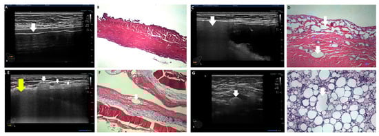 Ultrasonographic images of silicone breast implant rupture. Comparison between ultrasonographic findings regarding pathology. (A) Subcapsular silicone rupture in ultrasonography (a white arrow indicates free silicone); (B) pathologic finding of subcapsular rupture (there is no silicone migration in capsule); (C) intracapsular silicone rupture in ultrasonography (a white arrow indicates free silicone); (D) pathologic finding of intracapsular silicone invasion (a white arrow indicates silicone migration); (E) extracapsular silicone migration to adjacent tissue with snowstorm sign (snowstorm sign indicated by a yellow arrow, silicone migration to adjacent tissue is indicated by a white arrow); (F) pathologic finding of extracapsular silicone migration (a white arrow characterizes silicone migration to capsules); (G) silicone migration to regional lymph nodes (a white arrow indicates snowstorm artifact); and (H) pathologic finding of silicone migration to a regional lymph node(a white arrow indicates free silicone).