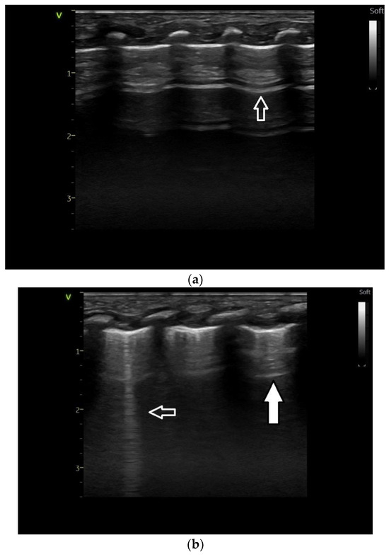 (a) Lung ultrasound. Normal image: A line—arrow—horizontal line parallel to the pleural line; (b) lung ultrasound. Normal image: A line—horizontal line parallel to the pleural line—reflection of the parietal pleura—white arrow—B line—white contour arrow—vertical line, with the origin at the visceral pleura, like a laser beam.