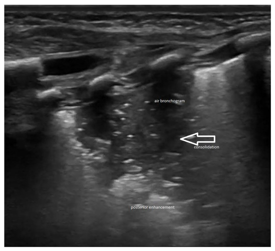 Lung ultrasound appearance in congenital pneumonia. Consolidation—arrow, air bronchogram—white spots and posterior enhancement with anfractuous appearance—shred sign.