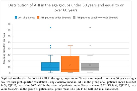 In the age group over 60 years, 25 (73%) of 34 patients had an AHI ≥ 5. Among these 25 patients, 15 (60%) had an AHI between 5 and <15, 7 (28%) had an AHI between 15 and <30, and 3 (12%) had an AHI ≥ 30. The average AHI in this group was 13.6, with a standard deviation of 14.6. There was no significant difference in AHI between the two age groups (Mann–Whitney U Test p = 0.62).