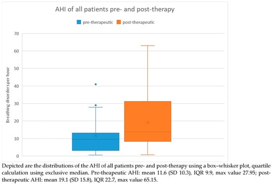 When considering all patients, the pre-therapeutic AHI ranged from 0.6 to 41 with a mean of 11.6 and a standard deviation of 10.3. Post-therapeutically, the AHI ranged from 0.8 to 63.1 with a mean of 19.1 and a standard deviation of 15.8. Regarding the difference in AHI between pre- and post-therapeutic measurements, the minimum was −40.2 and the maximum was 45.9, with a mean of 7.5 and a standard deviation of 16.7.
