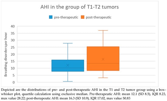When comparing the pre-therapeutic AHI measurements between the T1/T2 tumor group and the T3/T4 tumor group, the Mann–Whitney U test did not reveal a significant difference (p = 0.47). In the T1/T2 tumor group, the pre-therapeutic AHI ranged from 0.6 to 27.8 with a mean of 12.1 and a standard deviation of 8.5. Post-therapeutically, the AHI ranged from 3.1 to 37 with a mean of 16.3 and a standard deviation of 10.9. Regarding the difference in AHI between pre- and post-therapeutic measurements, the minimum was −9.3 and the maximum was 22.4, with a mean of 4.3 and a standard deviation of 9.2 (Figure 4). Statistical analysis using the Wilcoxon signed-rank test showed no significant difference (p = 0.20) between pre- and post-therapeutic measurements in this group.