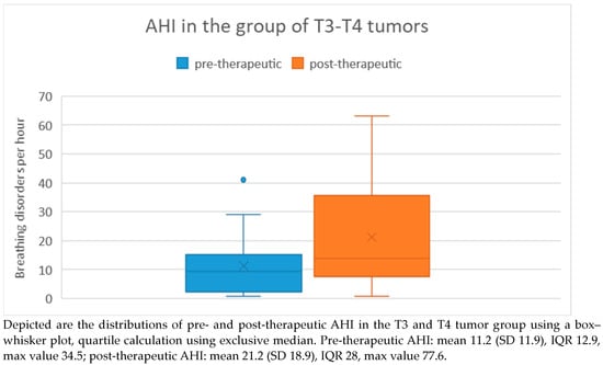 In the T3/T4 tumor group, the pre-therapeutic AHI ranged from 0.8 to 41 with a mean of 11.2 and a standard deviation of 11.9. Post-therapeutically, the AHI ranged from 0.8 to 63.1 with a mean of 21.2 and a standard deviation of 18.9. Regarding the difference in AHI between pre- and post-therapeutic measurements, the minimum was −40.2 and the maximum was 45.9, with a mean of 10 and a standard deviation of 20.9 (Figure 5). Statistical analysis using the Wilcoxon signed-rank test revealed a significant difference (p = 0.019) between pre- and post-therapeutic measurements in this group.