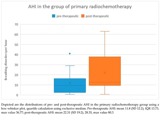 Sleep-related breathing disorders are not only common in the general population but are also frequently found in head and neck cancer patients [,,,].The aim of this study was to determine whether there is a difference in sleep-related breathing disorders between patients with head and neck tumors and an age-adjusted cohort of the general population. We also wanted to assess the impact of treatment on these sleep-related breathing disorders. Untreated obstructive sleep apnea not only has negative health consequences but also leads to reduced quality of life and worse outcomes following treatment for head and neck cancer [,,]. Previous studies have shown that there may be an increased prevalence of such breathing disorders, especially in the head and neck cancer patient group [,]. However, it has not been definitively shown whether patients already have a pathologically elevated AHI before undergoing treatment or whether it worsens during the course of therapy.