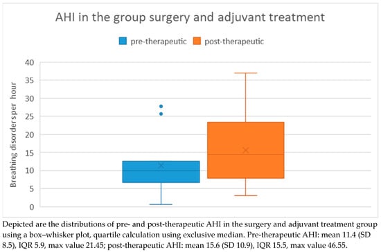 Among patients who underwent surgical treatment with subsequent adjuvant therapy, the pre-therapeutic AHI ranged from 1 to 28 with a mean of 11.4 and a standard deviation of 8.5. Post-therapeutically, the AHI ranged from 3 to 37 with a mean of 15.6 and a standard deviation of 10.9. Regarding the difference in AHI between pre- and post-therapeutic measurements, the minimum was −9.3 and the maximum was 22.4, with a mean of 4.2 and a standard deviation of 8.8 (Figure 7). Statistical analysis using the Wilcoxon signed-rank test did not reveal a significant difference (p = 0.182) between pre- and post-therapeutic measurements in this group.