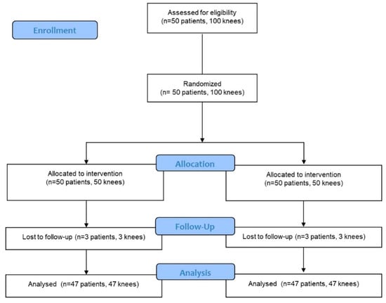Statistical analysis was performed using SPSS software (IBM SPSS Statistics 21; IBM Corp, Somers, NY, USA) with statistical significance set at p < 0.05. A priori power analysis revealed that the detection of a standardized difference of 1 in KSS satisfaction between the two groups required a sample size of 48 to achieve a power of 0.80 (type II error) and an alpha of 0.01 (type 1 error) []. Considering a 10% dropout rate, 47 knees per group were adequate. Student’s t test was used to compare continuous variables between both groups. Preoperative and postoperative parametric or non-parametric variables were compared using the paired t-test or Wilcoxon signed-rank test. Categorical variables were compared with Chi-square tests.