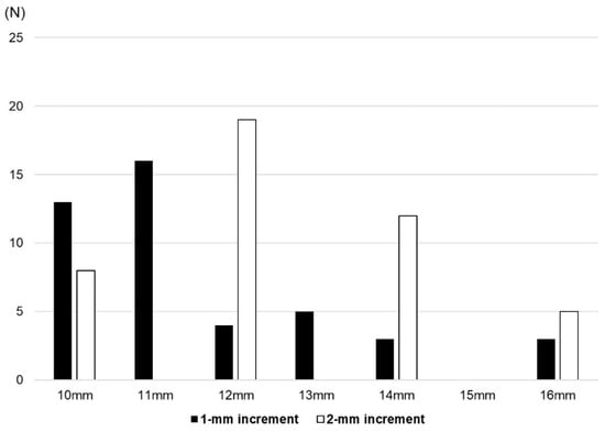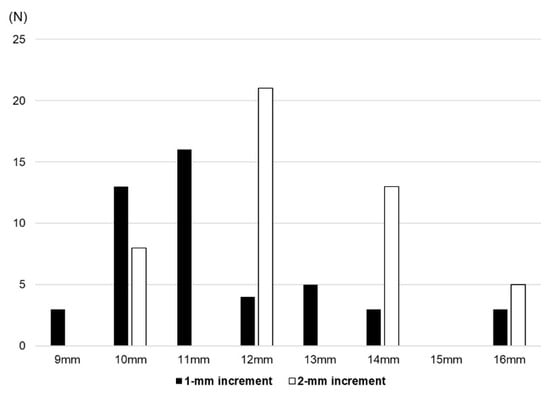 The mean PE insert thickness was significantly thinner in the 1 mm group than the 2 mm group (11.5 ± 1.8 mm vs. 12.8 ± 1.6 mm, p = 0.001). The minimum PE insert thickness for Exult is 9 mm and that for Lospa is 10 mm (Figure 3). Even when excluding three patients who used a 9 mm PE insert of the Exult knee system on one knee, the mean PE thickness of the 1 mm group was significantly thinner (11.6 ± 1.7 mm vs. 12.7 ± 1.8 mm, p = 0.008) (Figure 4). The rate of thick PE insert usage (≥14 mm) was 12.7% and 38.3% in the 1 mm group and 2 mm group, respectively (p = 0.005) (Table 3).