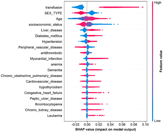 In males, the feature value for wound infection was the second highest after transfusion. Multiple clinical investigations have indicated sex-based variations in the occurrence of sepsis and its consequences [10]. In a bacteremia epidemiological study, sepsis was more prevalent among males than females [11,12]. Previous studies have presented disadvantages for the male sex due to hormonal differences and an additional high prevalence of malnutrition and comorbidities [13,14,15,16]. Various hypotheses derived from previous studies support our results.