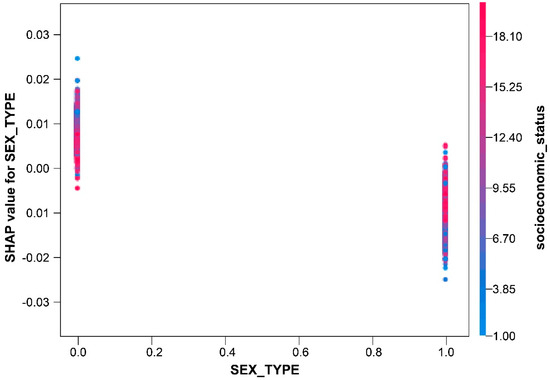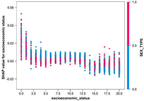 In the socioeconomic status dependence plot, the lower the socioeconomic status (SES), the greater the SHAP value, indicating a high wound infection rate (Figure 5).