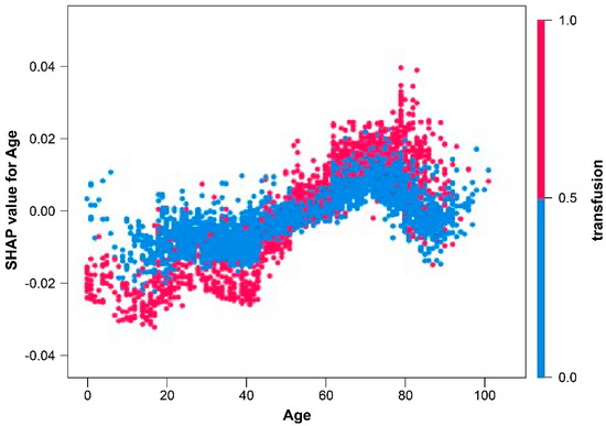 In the age-dependent plot, the SHAP values tended to increase slightly with age. This indicates that the incidence of wound infection increases with age. The right Y-axis displays the correlation with transfusions. According to this plot, a large number of people < 20 years of age received a transfusion, and as age increased, the SHAP values for wound infections also increased. Simultaneously, when comparing the Y-axis of the same age, an individual who received a transfusion, displayed as a red dot, had a larger SHAP value (Figure 4).