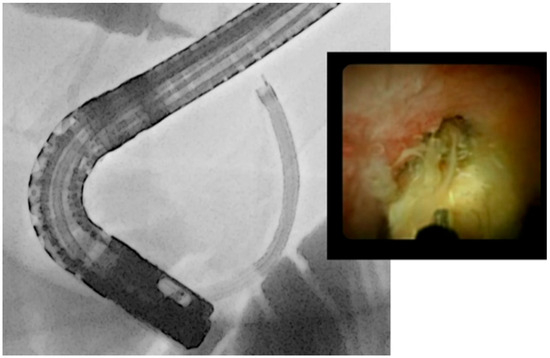 Advanced ERCP procedures have also emerged, such as single operator cholangioscopy (SOC) with holmium laser lithotripsy (LL) or electrohydraulic lithotripsy (EHL) [7]. Cholangioscopy was first introduced in the early 1970s as a dual-operator cholangioscopy, also known as “mother–daughter cholangioscopy” (MDC) [51]. This cumbersome technique was soon replaced by single-operator cholangioscopy (SOC) with a fiber scope in its first generation (SpyGlass; Boston Scientific, Marlborough, MA, USA) while its second generation introduced a digital scope around the mid-2000s (SpyGlass DS, D-SOC) [52]. Apparently, the D-SOC system improves the diagnostic yield during ERCP for pancreaticobiliary diseases and it also diminishes the procedure time, resulting in minimum radiation exposure, compared to fiber scopes SOC [53] (Figure 4). Direct peroral cholangioscopy (DPOC) is a technological advancement that has also been introduced to the market with a larger working channel and electronic chromoendoscopy capabilities [54]. However, DPOC appears more challenging since there is a risk of gastric looping, while cases of air embolization have also been reported. In 2019, an observational study was published with 79 patients undergoing DPOC after an initial ERCP procedure with incomplete stone extraction. The ultra-slim scope was inserted immediately into the CBD of only 14 patients, while a guide wire and overtube assistance were used in 54 and seven patients respectively to facilitate the procedure. DPOC was unsuccessful in four patients [55].