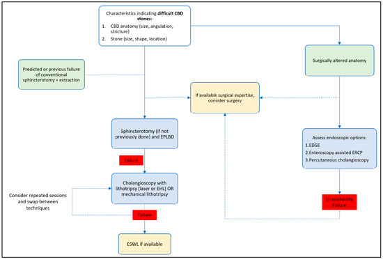 A proposed algorithm is displayed in Figure 5, about the management of difficult bile duct stones. In the future, a standardized classification scoring system of the variables could stratify the risk–benefit ratio of each technique and propose the ERCP-type (conventional or advanced cholangioscopy).