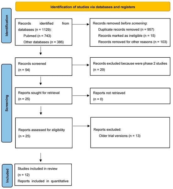 The study selection process is outlined in Figure 1. Initially, 1129 items were identified through a literature search. After the screening process, 25 articles were shortlisted. Of these, 13 were excluded due to their focus on chemotherapies not involving anthracycline or taxane or their failure to provide pCR data specifically for TNBC patients. Consequently, 12 studies were deemed suitable and met the stringent inclusion criteria, as referenced in citations [,,,,,,,,,,,,,].