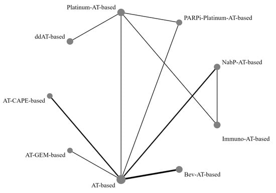 Network structure diagrams for pathologic complete response among different direct comparisons (using network meta-analysis, we can estimate the relative effectiveness of treatments when a direct comparison is not available). Direct comparisons are represented by the black lines connecting the neoadjuvant therapy regimens. Line width is proportional to the number of trials, including every pair of neoadjuvant regimens, whereas circle size is proportional to the total number of trials for each neoadjuvant regimen in the network. AT-based, anthracyclines/taxanes chemotherapy; ddAT, dose dense-anthracyclines/taxanes chemotherapy; AT-CAPE, anthracyclines/taxanes + capecitabine chemotherapy; AT-GEM, anthracyclines/taxanes + gemcitabine chemotherapy; Bev-AT, anthracyclines/taxanes + bevacizumab chemotherapy; Immuno-AT, anthracyclines/taxanes + immunotherapy-based chemotherapy; Nab-P-AT, anthracyclines + nab-Paclitaxel chemotherapy; PARPi-Platinum-AT, anthracyclines/taxanes + platinum agents + PARP inhibitors-based chemotherapy; Platinum-AT, anthracyclines/taxanes + platinum agents chemotherapy.