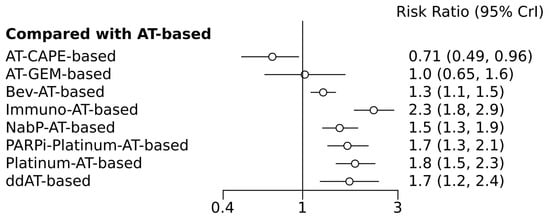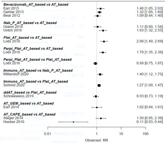 Pairwise direct comparisons of standard vs. more intense anthracycline/taxanes-based chemotherapy schedules (on the left, direct comparisons and authors/years of publication), on the right, the relative risk of pathologic complete response with experimental compared with control arms. AT-based, anthracyclines/taxanes chemotherapy [,,,,,,,,]; ddAT, dose dense-anthracyclines/taxanes chemotherapy [,]; AT-CAPE, anthracyclines/taxanes + capecitabine chemotherapy [,]; AT-GEM, anthracyclines/taxanes + gemcitabine chemotherapy []; Bev-AT, anthracyclines/taxanes + bevacizumab chemotherapy [,,]; Immuno-AT, anthracyclines/taxanes + immunotherapy-based chemotherapy [,]; Nab-P-AT, anthracyclines + nab-Paclitaxel chemotherapy [,,]; PARPi-Platinum-AT, anthracyclines/taxanes + platinum agents + PARP inhibitors-based chemotherapy []; Platinum-AT, anthracyclines/taxanes + platinum agents chemotherapy [,].