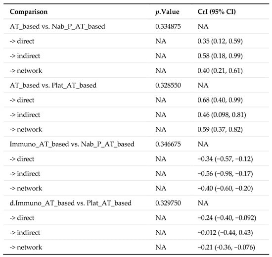 Fixed-effects and consistency models were used in the NMA. Non-informative priors were set, and posterior distributions were obtained using 40,000 iterations after 20,000 burns and a thinning interval of 10. Network meta-analysis results for pCR are reported as relative risks (RRs) with 95% credible intervals (CrIs). The probability of each treatment regarding survival outcomes was ranked according to the RRs and posterior probabilities. Network meta-analysis results for EFS/DFS are reported as hazard ratios (HRs) with 95% credible intervals (CrIs). The probability of each treatment regarding survival outcomes was ranked according to the HRs and posterior probabilities. Statistical significance was set at p < 0.05, indicating statistical significance. For EFS/DFS, we calculated the mean log HR and its standard error and entered it into the model, while for pCR we entered the number of events in each arm.