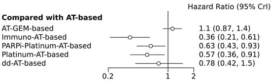 Forest plots of indirect comparisons between different neoadjuvant chemotherapies (disease-free survival/event-free survival) in breast cancer compared to the referent standard arm (anthracyclines/taxanes only chemotherapy). AT-based, anthracyclines/taxanes chemotherapy; ddAT, dose dense-anthracyclines/taxanes chemotherapy; AT-CAPE, anthracyclines/taxanes + capecitabine chemotherapy; AT-GEM, anthracyclines/taxanes + gemcitabine chemotherapy; Bev-AT, anthracyclines/taxanes + bevacizumab chemotherapy; Immuno-AT, anthracyclines/taxanes + immunotherapy-based chemotherapy; Nab-P-AT, anthracyclines + nab-Paclitaxel chemotherapy; PARPi-Platinum-AT, anthracyclines/taxanes + platinum agents + PARP inhibitors-based chemotherapy; Platinum-AT, anthracyclines/taxanes + platinum agents chemotherapy.