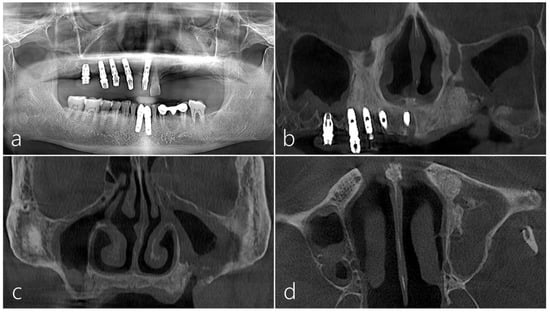 Lateral maxillary sinus augmentation (MSA) enables successful implant placement in the maxillary posterior region with insufficient residual bone height and pneumatized maxillary sinus [,]. Various early or late complications after MSA procedures have been reported []. Early complications are mostly related to sinus membrane perforation, the spill of bone graft materials, the plugging of the ostium, and sinus graft infection/postoperative sinusitis [,]. Late complications occur in cases with delayed sinus graft infection after implant loading when the grafted sinus is infected with peri-implantitis [].