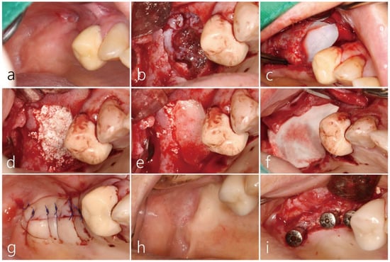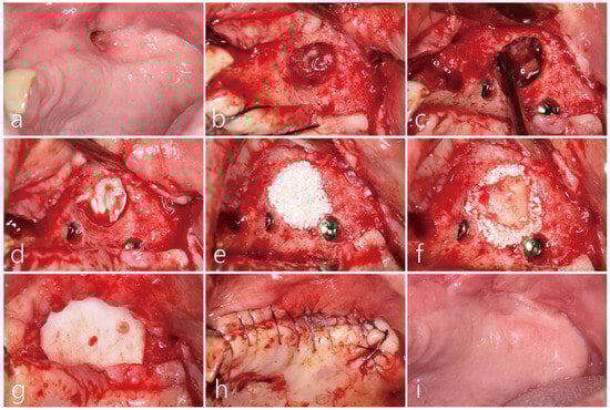 Due to severe sinus mucosal thickening, we had the patient consult with an otolaryngologist. Nasal irrigation with a two-week course of antibiotics (amoxicillin/clavulanate potassium 375 mg, three times a day) was performed. Her glucose and HbA1c levels were well controlled. Before surgery, an OAF was observed on the buccal side of the right posterior area (Figure 8a). Under local anesthesia, the buccal mucoperiosteal flap was reflected. A very wide bony defect (1.5 × 2.0 cm) was observed, and the sinus membrane exhibited a proliferation of inflammatory tissue around the OAF. Debridement was performed on the infected bone graft and the surrounding granulation tissue (Figure 8b). The sinus mucosa was carefully separated from the sinus floor and then further elevated, forming a pouch within the maxillary sinus. The inflammatory exudate within the maxillary sinus was meticulously suctioned through the OAF site, and thorough saline irrigation was performed. The OAF site at the top of the pouch was covered with a resorbable collagen membrane (Genoss Co., Ltd., Suwon, Republic of Korea) (Figure 8c), and the pouch was filled with a particulate bone graft substitute (Osteon II™, Genoss Co., Ltd., Suwon, Korea) (Figure 8d). The entrance of the pouch was covered with a cortical bone shell graft harvested from the contralateral sinus window (Figure 8e). Finally, the surgical site was covered with a resorbable collagen membrane (Genoss Co., Ltd., Suwon, Republic of Korea) (Figure 8f). The mucoperiosteal flap was closed with 5-0 nylon (Figure 8g). The patient was prescribed antibiotics (ciprofloxacin 500 mg, Ildong Phamaceutical Co, Seoul, Korea) and an analgesic anti-inflammatory drug for 2 weeks. Additionally, the patient was advised not to blow her nose. The surgical site healed uneventfully and the OAF was successfully closed (Figure 8h). Six months later, the mucoperiosteal flap was reflected for implant placement, and the previous wide defect was filled with bone-like tissue. Three implants (Ø 4.0 × 10 mm, Osstem implant, Seoul, Republic of Korea) were placed. Because the initial stability was good, the healing abutment was connected to the implant (Figure 8i). The prosthesis was delivered five months later.