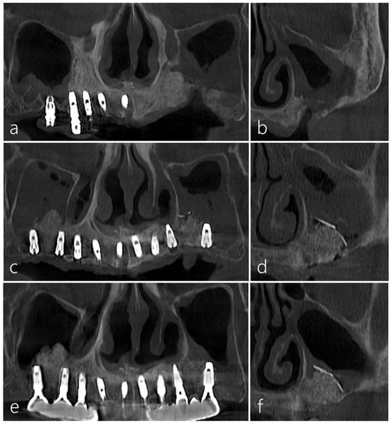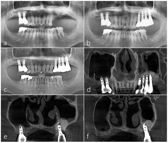 Panoramic radiography conducted immediately after MSA using a cortical bone shell and particulate bone graft showed radiopaque bone density in the left maxillary sinus (Figure 6a). Four implants were placed 6 months after MSA, and the prosthesis delivery was performed 6 months after the implant’s placement (Figure 6b). Panoramic radiography taken five years after the prosthesis delivery showed well-maintained augmented bone and implants in the left posterior area (Figure 6c). On the panoramic and coronal images of the CBCT taken 5 years after prosthesis delivery, the left sinus showed no significant mucosal thickening, and the augmented bone was well-maintained (Figure 6d–f).