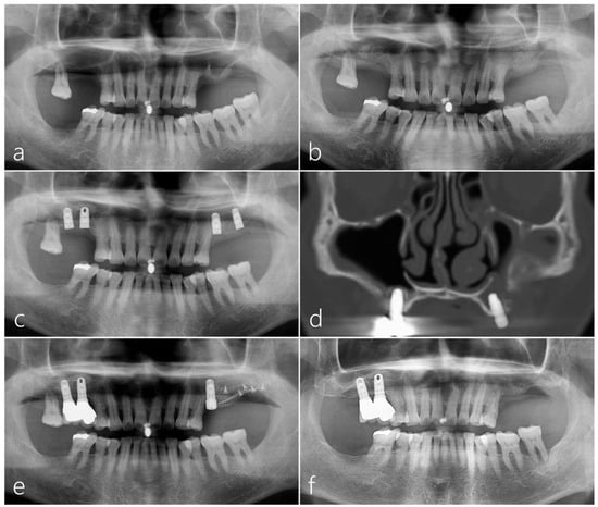 Case 2: (a) The panoramic radiography from the referred clinic showed pneumatized maxillary posterior area on both sides. (b) The maxillary sinus augmentation was performed at the referred clinic for implant placement. (c) Six months later, two HA-coated implants were placed on each side at the referred clinic. (d) The coronal CBCT scan showed a buccal bone defect with opacification of the left maxillary sinus. (e) The panoramic radiograph taken immediately after the revision procedure showed the augmented bone graft with titanium mesh and pins. (f) The panoramic radiograph taken when the patient was referred to our clinic revealed that the augmented bone graft had disappeared at the oroantral fistula site.