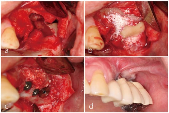 In May 2012, a guided bone regeneration technique using particulate bone, a cortical bone shell graft, and a barrier membrane was performed to reconstruct the missing ridge crest and close the OAF. Under local anesthesia, mucoperiosteal flaps were reflected on the buccal and palatal sides. A significant amount of the buccal bone, including the ridge crest, was observed to be lost (Figure 5a). Due to the risk associated with achieving implant stability, delayed implant placement was planned. The maxillary sinus mucosa had healed with scar-like tissue, appearing firm and thick. Consequently, an appropriate amount of this tissue was removed using a #15 Bard Parker blade. Adequate osseous housing was necessary to ensure effective blood supply from the sinus wall and stabilize bone graft substitutes within the wound. Hence, the sinus mucosa was meticulously detached from the sinus floor using various types of curettes, and a pouch within the maxillary sinus was created through additional elevation. Perforation of the sinus mucosa was repaired using a resorbable collagen membrane (Bio-Gide® Geistlich Pharma AG, Wolhusen, The Switzerland), and the pouch was subsequently filled with particulate bone graft (Bio-Oss®, Geistlich Pharma AG, Wolhusen, The Switzerland). Because the buccal defect was very large, the cortical bone shell graft obtained from the ascending ramus on the ipsilateral side was placed passively without the use of screw fixation (Figure 5b). Finally, after covering it with a resorbable collagen membrane (Bio-Gide® Geistlich Pharma AG, Wolhusen, Switzerland), the flap was secured closed. The patient was prescribed antibiotics (ciprofloxacin 500 mg, Ildong Pharmaceutical Co., Seoul, Republic of Korea) and a nonsteroidal anti-inflammatory drug for 2 weeks. During this period, the patient was instructed to refrain from blowing his nose. The surgical site healed uneventfully without any complications. After 6 months, a reentry procedure was performed for implant placement. The buccal mucoperiosteal flap was reflected and the extensive buccal bone defect was successfully filled with bone-like tissue. Four HA-coated implants (Zimmer TSV™, Zimmer Biomet Dental, Warsaw, IN, USA) were placed (Figure 5c). Six months after implant placement, the uncovering procedure was performed, followed by the delivery of the prosthesis. Scar tissue was observed on the buccal side due to multiple surgeries; however, revision surgery was not performed because the patient reported no discomfort (Figure 5d).