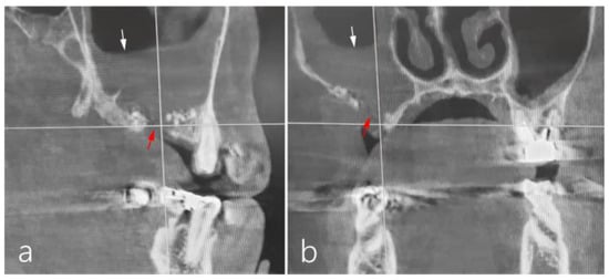 The patient was a 66-year-old female non-smoker with diabetes mellitus. In the referred clinic, she underwent MSA using a lateral approach. However, three weeks after MSA, severe edema and pus discharge were observed, leading to an I&D procedure in the vestibular area. Additionally, antibiotics were prescribed for three weeks by an otolaryngologist. The patient’s symptoms improved; however, an OAF developed. Despite three attempts to close OAF using bone grafts and a barrier membrane, the OAF persisted. On the sagittal image of CBCT, the previous augmented bone graft had mostly disappeared, and there was severe sinus mucosal thickening (Figure 7a). A bone defect extending from the ridge crest to the buccal side was observed on the coronal CBCT image (Figure 7b).