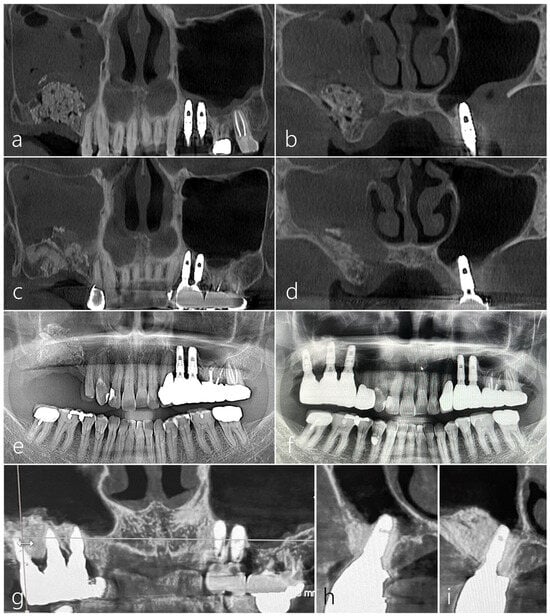 (a) The panoramic image of the CBCT taken immediately after surgery revealed an augmented bone graft in the right sinus. (b) On the coronal image of the CBCT, an augmented bone graft was observed in the buccal bone defect around the OAF site. (c) The panoramic image of CBCT taken 6 months later showed well-maintained augmented bone height. (d) On the coronal image of the CBCT taken 6 months later, some contraction of the bone graft area was observed, and the maxillary sinus was completely opacified. (e) Panoramic radiography conducted 6 months after bone grafting showed well-maintained augmented bone. (f) In panoramic radiography conducted 12 months after the prosthesis was delivered, sufficient bone graft was observed around the implants. (g) The CBCT images taken 12 months after the prosthesis delivery showed significantly reduced mucosal thickening on the right maxillary sinus. (h,i) On the CBCT images taken 12 months after the prosthesis was delivered, a well-maintained augmented bone around the implants was shown.