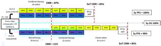 Despite the robust data, research in HL (phase II studies) treatment is changing with the incorporation of BV in early Hodgkin lymphoma, and checkpoint inhibitors in first-line treatment []. One of the largest studies on BV in early-stage, unfavorable HL was the BREACH study (n = 170) []. The initial treatment consisted of two cycles of either ABVD or BV-AVD, followed by interim PET. Subsequent therapy included two more cycles, but it was not PET-adapted. The primary outcome was the rate of interim PET negativity in the BV group, which was achieved with 82.3% in the BV group compared to 75.4% in the ABVD group. There was no difference in iPET-negative groups among the regimes, unlike in iPET positive groups, where the 2-year PFS was 93.8% and 71.8%, respectively. This suggests that a BV-based regimen may overcome this negative prognostic factor. Regarding checkpoint inhibitors, most data are available on nivolumab. The Phase II NIVAHL study, which included 109 patients, is illustrated in Figure 1 [].