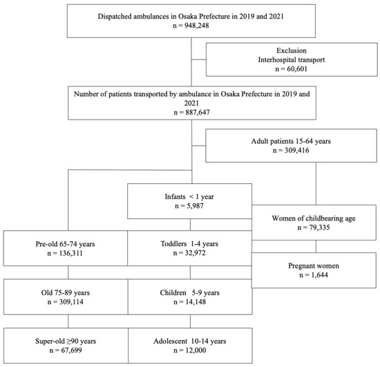 This study was a retrospective, descriptive study with a study period from 1 January 2019 to 31 December 2019 and from 1 January 2021 to 31 December 2021 using the Osaka Emergency Information Research Intelligent Operation Network (ORION) system [11]. Osaka Prefecture, the largest metropolitan community in western Japan, has a population of about 8.8 million and a total area of 1905 km2. To assess the influence of the COVID-19 pandemic on the EMS system, we focused on vulnerable patients transported by ambulance in Osaka Prefecture. Pediatric patients were divided into four age groups: infants, 0 years; toddlers, 1–4 years; children, 5–9 years; and adolescents, 10–14 years [4]. We defined “women of childbearing age” as female patients aged 15–44 years [12]. We used the presumptive diagnosis and final diagnosis for patients who were admitted, using the International Classification of Diseases, 10th revision (ICD-10) [13]. The present study defined patients with pregnancy-related issues (pregnant patients) as ICD-10 codes O00–O99 and P00–P96. We also classified elderly patients according to the Japan Gerontological Society: pre-old, 65–74 years; old, 75–89 years; and super-old, ≥90 years [14]. We collected “COVID-19” data as ICD-10 code U07.1, and “COVID-19 suspected” data (if the presence of the virus was not confirmed) as U07.2.