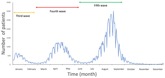 Newly diagnosed COVID-19 cases in Osaka Prefecture, Japan, in 2021. Three waves (third, fourth, and fifth waves) of the COVID-19 pandemic occurred in 2021.