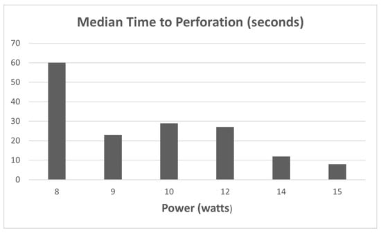 From the 104 data points collected during the 1st phase of the study (Ho:YAG laser safety in the bile duct), the median perforation times were as follows as seen in Figure 3: 8 W (>60 s); 9 W (23 s); 10 W (29 s); 12 W (27 s); 14 W (12 s); and 15 W (8 s). Statistically significant differences in median perforation times were noted between 8 W vs. 15 W, 9 W vs. 15 W, 10 W vs.15 W, and 12 W vs.15 W (p < 0.05). There was no statistical difference between 14 and 15 W.