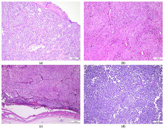 MM different histopathological patterns: (a) achromic epithelioid cell melanoma; (b) pigmented, spindle cell melanoma; (c) achromic spindle cell melanoma; (d) achromic spindle and clear cell melanoma; H&E, ×10.