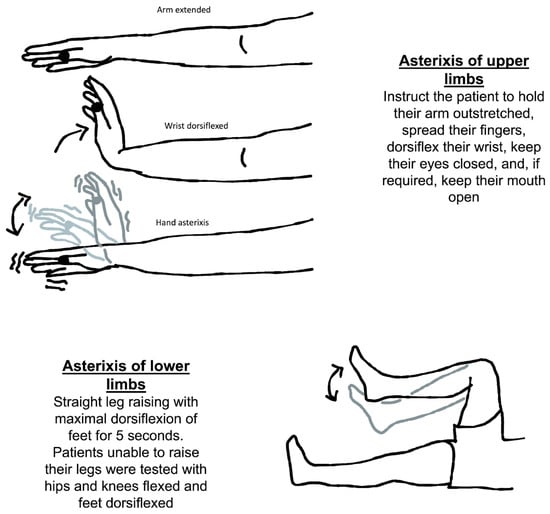 - Leavitt, S.; Tyler, H.R. Studies in Asterixis. Arch. Neurol. 1964, 10, 360–368. [Google Scholar] [CrossRef] [PubMed]