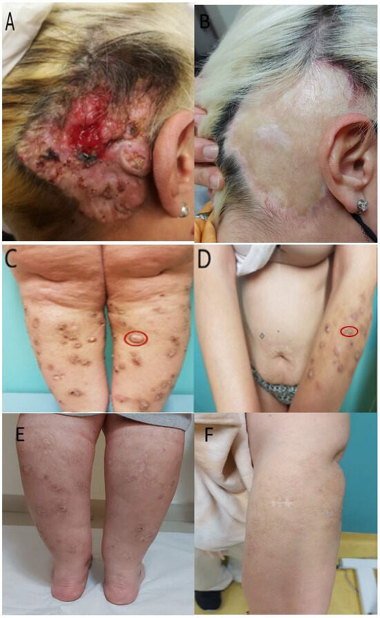 (A) Image showing an extensive ulcer with a nearby nodule expanding in the retroarticular area covering a large portion of the head skin. (B) Image showing the plastic surgery restoration after the removal of the lesion area. (C,D) Images showing dome-shaped, circumscribed, hyperkeratotic nodules with a skin-colored periphery located mainly on the front surface of the knees and arms. The lesion in the circle was biopsied. (E,F) Image showing the regression of the lesions after treatment with cryotherapy in combination with topical treatment with cream 5 FU 5% as well as acitretin (0.5 mg/kg/day).