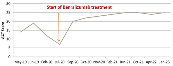 Asthma control as assessed by ACT score before and after anti IL-5R treatment.