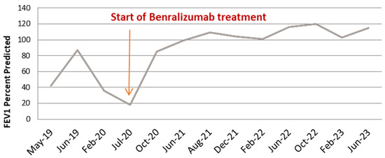 Although the patient was on treatment with OCS to control the clinical symptoms and reduce hypereosinophilia, and despite an adequate inhalation technique and good adherence to high doses of the inhaled corticosteroid and bronchodilator treatment, the trend of clinical, biological, and functional deterioration was maintained. At this point, the necessity to distinguish the predominant phenotype of the airway disease in this patient became very important. On one hand, the patient had features of COPD, like an onset age of disease of higher than 40 years and exposure to inhaled noxious particles, tobacco smoke, and biomass fuels, with respiratory symptoms worsening over time and persistent airflow limitation (post-BD FEV/FVC < 0.7). On the other hand, the extremely high variability of symptoms and functional tests over time, as well as a good response to ICS/OCS, were the decisive arguments for the diagnosis of asthma. The presence of hypereosinophilia > 1000 cells/mmc required a differential diagnosis of a parasitic infection, in particular, helminthiasis, and eosinophilic granulomatosis with polyangiitis. Due to the rapid succession of exacerbation episodes and worsening of the patient’s clinical status on one hand, and due to the immense pressure exerted by the COVID-19 pandemic on the healthcare system in general, and to our hospital in particular, on the other, the two conditions were excluded based on clinical grounds. Our country is not endemic for helminth infection, and the patient did not travel abroad and did not report any gastro-intestinal symptoms suggestive for helminthiasis. The patient also did not report any symptoms related to the upper respiratory tract, such as rhinitis, nasal polyposis, or sinusitis. The chest X-ray did not demonstrate the presence of pulmonary infiltrates and no physical signs of vasculitis or neuropathy were noticed. Thus, the decision was taken to start biological treatment with an anti-IL-5R monoclonal antibody—benralizumab, 30 mg/month in the first 2 months, and then, 30 mg every 2 months.