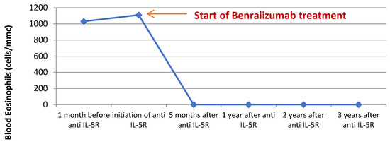 - Tsurumaki, H.; Matsuyama, T.; Ezawa, K.; Koga, Y.; Yatomi, M.; Aoki-Saito, H.; Chikamatsu, K.; Hisada, T. Rapid Effect of Benralizumab for Hypereosinophilia in a Case of Severe Asthma with Eosinophilic Chronic Rhinosinusitis. Medicina 2019, 55, 336. [Google Scholar] [CrossRef] [PubMed]