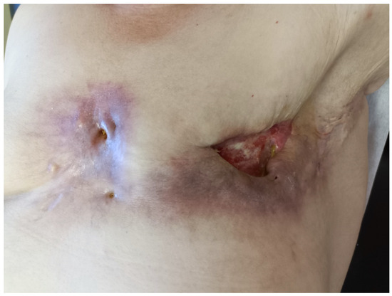 Figure 1. Initial local status of the patient before the surgery; multiple ulcerations and fistulae in the scar after the left mastectomy.
