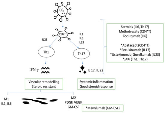 Lesional CD4+ T cells are polyfunctional. Different types of cytokines have been tracked in the GCA wall, including IFN-γ, IL-2, IL-17, IL-21, IL-22, and GM-CSF. The dominant cytokine is IFN-γ, a high amount of which is found in the vascular wall but also in the periphery. It is a major effector cytokine, being responsible for the activation of macrophages, DCs, and endothelial cells. IFN-γ+ T cells are dependent on Janus kinase and signal transducer and activator of transcription (STAT) action, with a low response to glucocorticoids; therefore, blocking the JAK pathway could probably be a better solution []. IL-22 might represent the link between immune cells and stromal cells, while GM-CSF is an important activator of macrophages and links these cells by their granuloma appearance. IL-17 is a proinflammatory cytokine that is easily suppressed by therapy with glucocorticoids and has a pleiotropic effect on a large number of cells: macrophages, endothelial cells, vascular smooth muscle cells (VSMC), and fibroblasts. IL-17 is linked to IL-6 because Th17 differentiation of T cells and malfunction of Treg are regulated by IL-6 [,].
