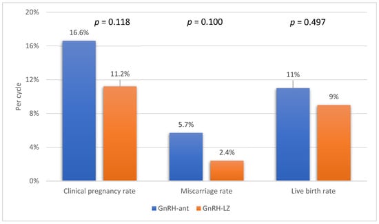 | Outcome Parameter (Per Cycle) | GnRH-ant (n = 121) | GnRH-LZ (n = 56) | GnRH-ant (n == 160) | GnRH-LZ (n = 112) | ||