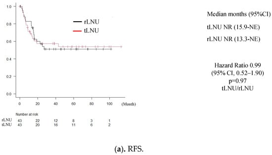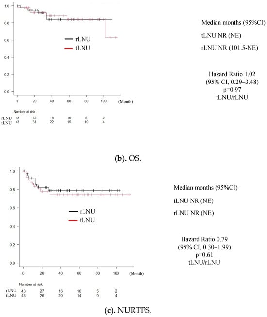 Figure 1 shows the RFS, OS, and NUTRFS in the adjustment groups. With regard to the RFS, 19 patients (44%) in the tLNU group and 18 patients (42%) in the rLNU group had recurrences. The 2-year RFS rate was 62.8% in the tLNU group and 60.4% in the rLNU group, with no significant differences (HR = 0.99 (95% CI, 0.52–1.90), p = 0.98) (Figure 1a). With regard to the OS, there were five deaths (11.6%) in the tLNU group and six deaths (14.0%) in the rLNU group. The 2-year overall survival rate was 95.3% in the tLNU group and 90.6% in the rLNU group, with no significant differences (HR = 1.02 (95% CI, 0.29–3.48), p = 0.97) (Figure 1b). As for the NUTRFS, non-urothelial tract recurrence was seen in 8 cases (18.6%) in the tLNU group and 10 cases (23.2%) in the rLNU group, with no significant differences (HR = 0.61 (95% CI, 0.30–1.99), p = 0.61) (Figure 1c).
