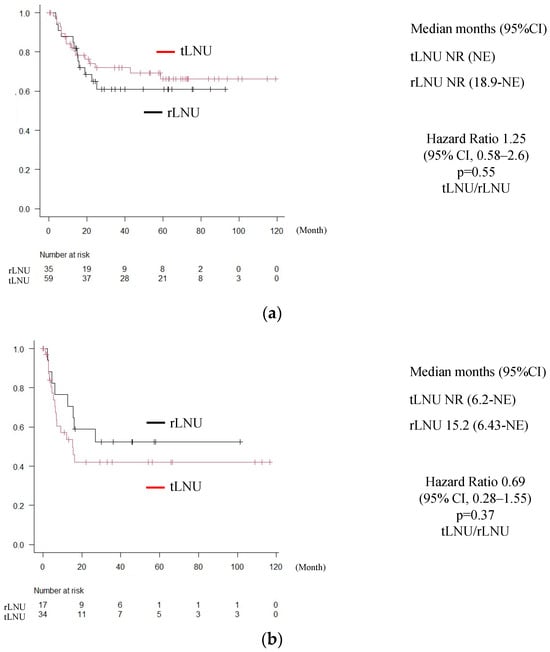 We conducted a subgroup analysis, as shown in Figure 2. When the RFS in patients with pT2 or lower was examined, recurrence was found in 12 cases (out of 35 cases; 34.3%) in the tLNU group and 17 cases (out of 59 cases; 28.8%) in the rLNU group, with no significant differences (HR = 1.25 (95% CI, 0.58–2.60), p = 0.55) (Figure 2a). As for the RFS in patients with pT3 or pT4, recurrence occurred in 8 cases (out of 17 cases; 47.1%) in the tLNU group and 17 cases (out of 34 cases; 50.0%) in the rLNU group, with no significant differences (HR = 0.69 (95% CI, 0.28–1.55), p = 0.37) (Figure 2b).