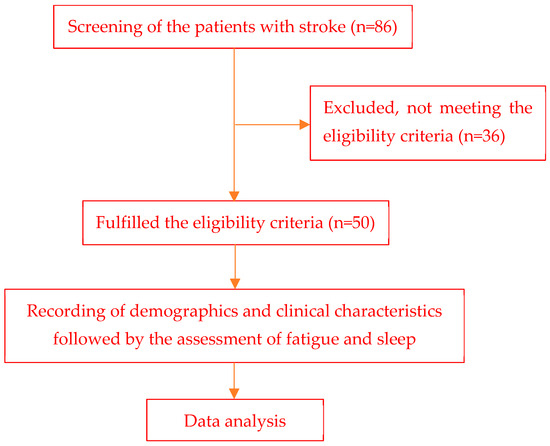 This cross-sectional study included 50 individuals after obtaining approval from the Institutional Ethics Committee, Jamia Millia Islamia, New Delhi, India. Patients were included if they were >18 years of age, it was the patient’s first stroke, they had an MMSE score of ≥ 24, and a stroke duration of fewer than 6 months. Stroke patients with speech difficulties (aphasia), psychiatric disorders such as schizophrenia, behavioral, or affective disorders, a history of depression, severe cognitive impairment, or dementia, a history of cerebrovascular accidents, multiple or bilateral stroke lesions, who had previously been treated for sleep problems, and had a stroke duration of less than one month were excluded from the study. Eighty-six subjects were screened for the study (Figure 1). The subjects were recruited from Dr. M. A. Ansari Health Centre & Centre for Physiotherapy and Rehabilitation Sciences and the nearby locality of Jamia Millia Islamia (JMI), New Delhi, India. Medical records were used to screen the patients’ suitability for study participation.