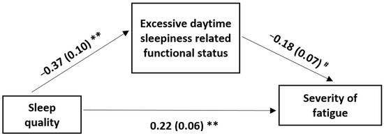 The model with sleep deficit-related functional loss (FOSQ score) as a mediator in the effect of sleep quality (PSQI score) on the severity of fatigue (FSS score). FOSQ: functional outcomes of sleep questionnaire; PSQI: Pittsburg sleep quality index; FSS: fatigue severity scale. The first values are the unstandardized coefficients, and the second values within brackets are the standard errors; ** p < 0.001; # p < 0.05. The indirect effect of sleep quality on the severity of fatigue through sleep deficit-related functional loss was significant (95% CI 0.07 [0.01, 0.13]).