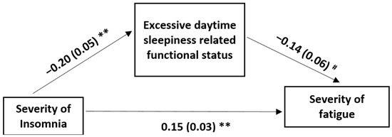 The model with the sleep deficit-related functional loss (FOSQ score) as a mediator in the effect of the severity of insomnia (ISI score) on the severity of fatigue (FSS score). FOSQ: functional outcomes of sleep questionnaire; ISI: insomnia severity index; FSS: fatigue severity scale. The first values are the unstandardized coefficients, and the second values within brackets are the standard errors; ** p < 0.001; # p < 0.05. The indirect effect of sleep quality on the severity of fatigue through sleep deficit-related functional loss was significant (95% CI 0.03 [0.002, 0.06]).