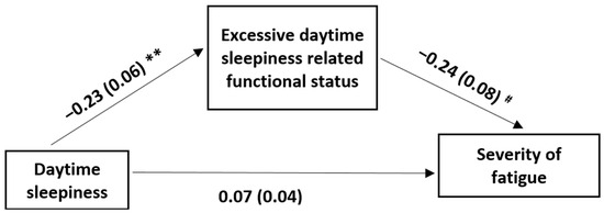 The model with sleep deficit-related functional loss (FOSQ score) as a mediator in the effect of daytime sleepiness (ESS score) on the severity of fatigue (FSS score). FOSQ: functional outcomes of sleep questionnaire; ESS: Epworth sleepiness scale; FSS: fatigue severity scale. The first values are the unstandardized coefficients and the second values within brackets are the standard errors; ** p < 0.001; # p < 0.05. The indirect effect of daytime sleepiness on the severity of fatigue through sleep deficit-related functional loss was significant (95% confidence interval 0.05 [0.01, 0.10]).