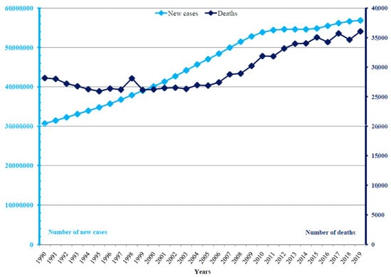 Globally, there were 56.7 million new cases of dengue reported in 2019: it was diagnosed in 27.4 million (48%) males and 29.3 million (52%) females (Figure 1 and Figure 2). A total of 36,055 (18,993 males and 17,032 females) related deaths were reported worldwide in 2019. The frequency of dengue increased greatly between 1990 and 2019, with the number of new cases almost doubling (from 30.7 million cases in 1990 to 56.9 million cases in 2019), and the number of deaths increased from 28,151 in 1990 to 36,055 in 2019.