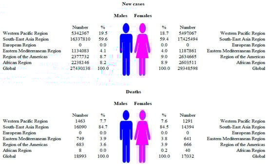 In males, most of the new cases of dengue (16.3 million; about 60% of the total) were recorded in the South-East Asia region, followed by the Western Pacific region (5.3 million; about 20%), in 2019 (Figure 2). Similarly to males, a dominant proportion of new cases of dengue in females was evident in the South-East Asia region (17.4 million; about 60% of the total), followed by the Western Pacific region (5.5 million; about 20%). In the European region, not a single autochthonous case of new illness or death from dengue was registered in either men or women. In 2019, most of the deaths from dengue were recorded in the South-East Asia region, both in males (16,090; about 85% of the total deaths in males) and females (14,394; about 85% of the total deaths in females).
